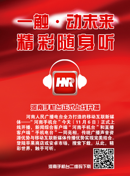 河南人民廣播電臺(tái)全力打造的移動(dòng)互聯(lián)新媒體——“河南手機(jī)臺(tái)”今天(11.6)正式上線開(kāi)播,新聞綜合客戶端“河南手機(jī)臺(tái)”和直播客戶端“手機(jī)電臺(tái)”一同亮相,傳統(tǒng)廣播聲音資源優(yōu)勢(shì)與移動(dòng)互聯(lián)新媒體傳播優(yōu)勢(shì)實(shí)現(xiàn)完美結(jié)合。登陸蘋(píng)果商店或安卓市場(chǎng),搜索下載,從此,精彩世界,觸手可聽(tīng)。