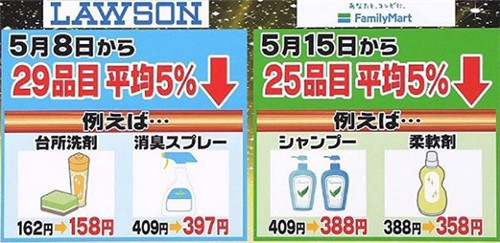 羅森和全家也迅速做出了反應(yīng)。5月8日起,羅森調(diào)整了店內(nèi)29款日用品的售價(jià);5月15日起,全家的洗滌劑、洗發(fā)水等25款日用品也降價(jià)了。這三家便利店的降價(jià)幅度普遍達(dá)到了5%。緊接著,規(guī)模小一些的便利店Mini Stop也宣布要降價(jià)。