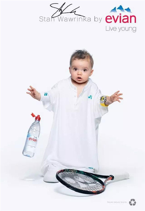 針對(duì)戶外、數(shù)字和社交網(wǎng)絡(luò)的創(chuàng)意則主要集中在一個(gè) Evian Young Team 的概念,一個(gè)由依云代言人莎拉波娃、Stan Wawrinka、Lucas Pouille、Madison Keys 以及高爾夫球員 Lydia Ko 等人組成的團(tuán)隊(duì)來拍攝廣告的主要視覺:喝了依云水之后,他們都換上一套 Oversize 的運(yùn)動(dòng)服,“變成了嬰兒”。