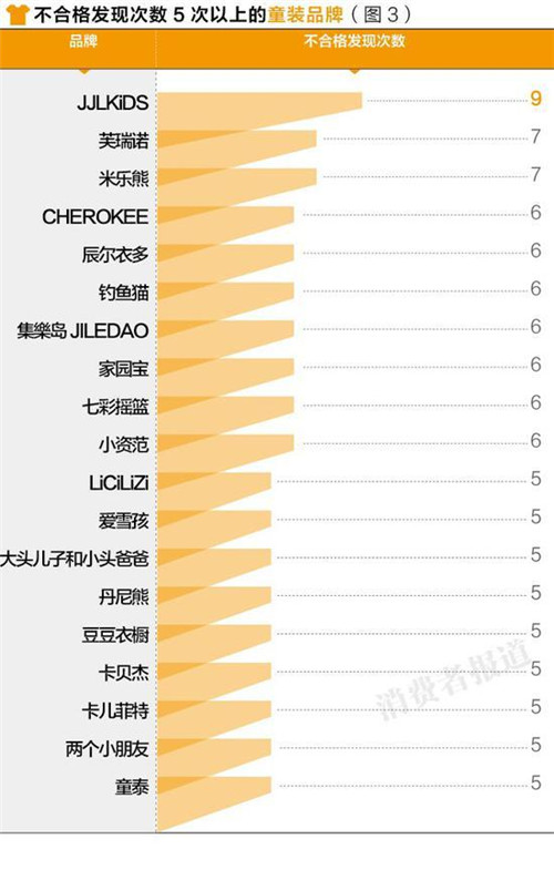 數(shù)據(jù)分析顯示,由郭濤父子代言的有30年創(chuàng)立歷史的季季樂(JJLKIDS)童裝的不合格發(fā)現(xiàn)次數(shù)竟高達(dá)9次。而兒童與嬰幼兒服飾的不合格項(xiàng)目集中在標(biāo)識(shí)、纖維含量、pH值、使用說明等方面。