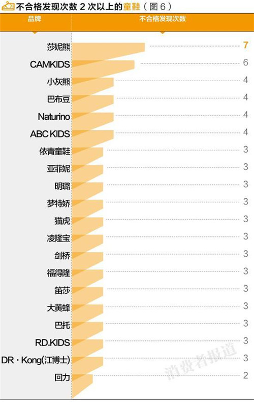 抽檢數(shù)據(jù)顯示,上海童鞋品牌莎妮熊的的不合格次數(shù)最高,而童鞋抽檢不合格的,回力也有兩次出現(xiàn)不合格。主要問題集中在強(qiáng)度硬度、標(biāo)識(shí)、感官質(zhì)量、高度(長(zhǎng)度)誤差等方面。