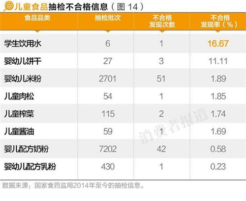 《消費(fèi)者報(bào)道》通過梳理國(guó)家食藥監(jiān)局2014年以來的12551條兒童食品抽檢數(shù)據(jù)發(fā)現(xiàn),兒童食品的合格率較高,達(dá)99%,而不合格品牌也是較為小眾品牌。本刊提醒消費(fèi)者謹(jǐn)慎購(gòu)買奶粉不合格次數(shù)較多的幾個(gè)品牌,如雅因樂、冠爾優(yōu)等。