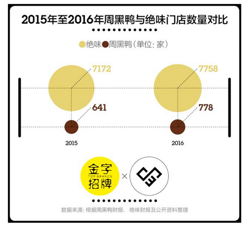 近兩年的市場(chǎng)表現(xiàn)沒有讓潘攀失望。根據(jù)咨詢公司弗諾斯特沙利文的數(shù)據(jù),中國(guó)休閑鹵制品零售總額從2010年的232億元增長(zhǎng)至2016年的637億元,年均復(fù)合增長(zhǎng)率為18.5%。截至2016年12月31日,周黑鴨全年?duì)I收約為28.16億元,較去年同期的24.32億元增長(zhǎng)15.8%。雖然778家的門店數(shù)量只有絕味的1/10左右,但周黑鴨的利潤(rùn)率是絕味的2倍多。