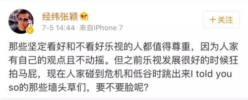 那些堅(jiān)定看好和不看好樂視的人都值得尊重,因?yàn)槿思矣凶约旱挠^點(diǎn)且不動搖。但之前樂視發(fā)展很好的時候狂拍馬屁,現(xiàn)在人家碰到危機(jī)和低谷時跳出來I told you so的那些墻頭草們,要不要臉呢?