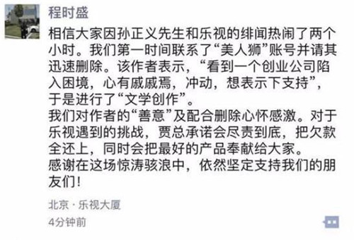 程時盛在朋友圈中寫到:相信大家因?qū)O正義先生和樂視的緋聞熱鬧了兩個小時。我們第一時間聯(lián)系了“美人獅”賬號并請其迅速刪除。該作者表示,“看到一個創(chuàng)業(yè)公司陷入困境,心有戚戚焉,沖動,想表示下支持”,于是進(jìn)行了“文學(xué)創(chuàng)作”。我們對作者的“善意”及配合刪除心懷感激。對于樂視遇到的挑戰(zhàn),賈總承諾會盡責(zé)到底,把欠款全還上,同時會把最好的產(chǎn)品奉獻(xiàn)給大家。感謝在這場驚濤駭浪中,依然堅(jiān)定支持我們的朋友們!
