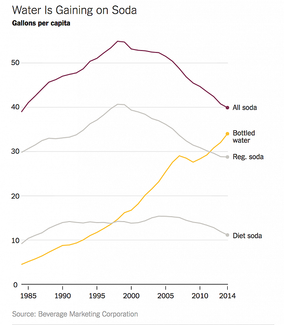 1960年代到1990年代,汽水公司經(jīng)歷過銷售量猛漲。而過去二十年里,汽水在美國的銷量暴跌了將近25%。而行業(yè)調研機構Beverage Digest最新數(shù)據(jù)顯示,美國汽水2016年的銷量滑入了近31年來的最低谷,較去年銷量又降低了0.8%。