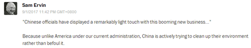 網(wǎng)友Sam Ervin:“‘中國(guó)官員對(duì)蓬勃發(fā)展的共享單車(chē)業(yè)務(wù)表現(xiàn)出柔性的監(jiān)管姿態(tài)?!绹?guó)不一樣,中國(guó)正在積極地改善環(huán)境,而不是破壞環(huán)境。”