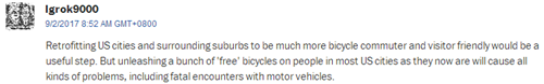 網(wǎng)友Igrok9000:“使用自行車(chē)確實(shí)利于改善城市和郊區(qū)環(huán)境。但對(duì)于美國(guó)大多數(shù)城市來(lái)說(shuō),一下子涌現(xiàn)出大量自行車(chē),會(huì)引發(fā)各種各樣的問(wèn)題,比如與機(jī)動(dòng)車(chē)相撞?!?/font>