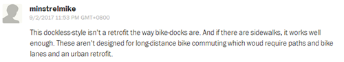 網(wǎng)友minstrelmike:“無(wú)樁式共享單車(chē)不適合遠(yuǎn)距離的騎行者,解決這個(gè)問(wèn)題還得靠自行車(chē)道的規(guī)劃和城市的改造?!?/font>