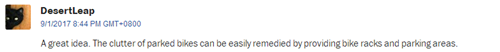 網(wǎng)友DesertLeap:“共享單車(chē)是好主意。擔(dān)心自行車(chē)停放引發(fā)混亂,可以增加自行車(chē)架和停車(chē)場(chǎng)?!?/font>