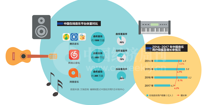 2016年7月,QQ音樂(lè)與酷我音樂(lè)、酷狗音樂(lè)并入騰訊音樂(lè)旗下后,騰訊開始對(duì)數(shù)字音樂(lè)版權(quán)著重布局。2017年3月和5月,騰訊音樂(lè)先后拿下中國(guó)大陸地區(qū)對(duì)環(huán)球音樂(lè)所擁有的音樂(lè)詞曲獨(dú)代權(quán)和數(shù)字版權(quán)分銷權(quán),并為此付出了3.5億美元現(xiàn)金及購(gòu)買環(huán)球音樂(lè)1億美元期權(quán)的代價(jià)?!敖刂聊壳?,全球范圍內(nèi)有200多家唱片公司持有數(shù)字音樂(lè)的版權(quán),目前90%以上都已經(jīng)被騰訊拿下?!币晃痪W(wǎng)易云音樂(lè)內(nèi)部人士告訴《中國(guó)經(jīng)濟(jì)周刊》記者,騰訊音樂(lè)目前擁有的版權(quán)數(shù)量、廣度和對(duì)版權(quán)的投入都是業(yè)內(nèi)第一,其中不少是“獨(dú)家代理權(quán)”,相當(dāng)于緊緊地扎起了一個(gè)籬笆。
