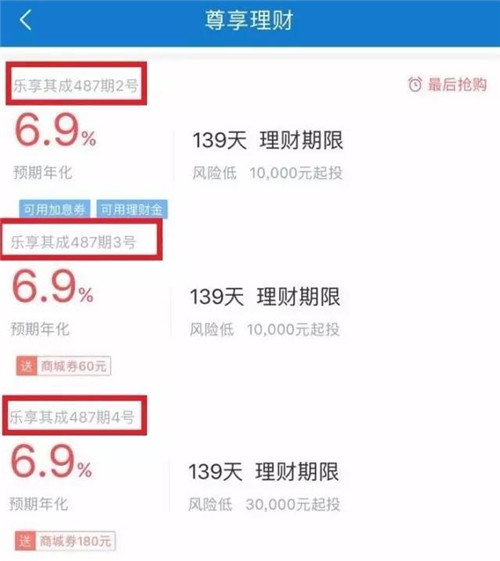 樂視金融APP上在售的樂享其成系列產品顯示,其中487期2號、3號和4號產品的投資期限完全相同,收益率也同為6.9%,并且都是7月7日起計算利息,只是2號和3號產品的理財起點起1萬元,4號產品的理財起點為3萬元。