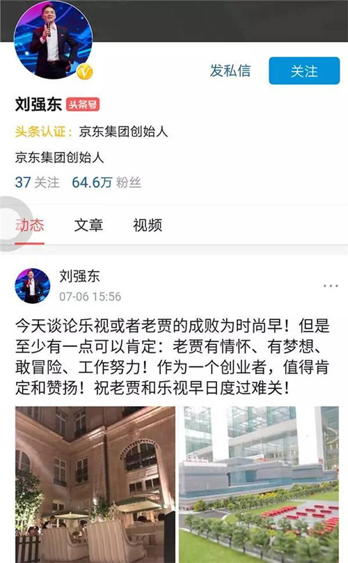 京東集團創(chuàng)始人劉強東在個人認證頭條號對樂視表示聲援,劉強東稱:今天談論樂視或者老賈的成敗為時尚早!但是至少有一點可以肯定:老賈有情懷、有夢想、敢冒險、工作努力!作為一個創(chuàng)業(yè)者,值得肯定和贊揚!祝老賈和樂視早日渡過難關!