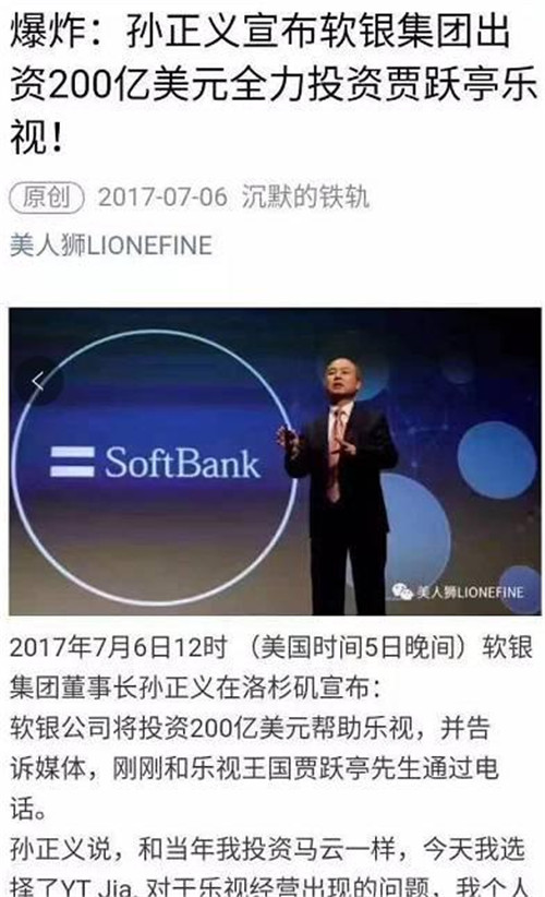 程時盛在朋友圈中寫到:相信大家因孫正義先生和樂視的緋聞熱鬧了兩個小時。我們第一時間聯(lián)系了“美人獅”賬號并請其迅速刪除。該作者表示,“看到一個創(chuàng)業(yè)公司陷入困境,心有戚戚焉,沖動,想表示下支持”,于是進行了“文學創(chuàng)作”。我們對作者的“善意”及配合刪除心懷感激。對于樂視遇到的挑戰(zhàn),賈總承諾會盡責到底,把欠款全還上,同時會把最好的產品奉獻給大家。感謝在這場驚濤駭浪中,依然堅定支持我們的朋友們!