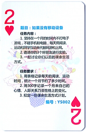 趙伊湄抽到了“紅桃2”。作業(yè)題目是:如果沒有移動(dòng)設(shè)備,同時(shí)給出了三項(xiàng)任務(wù),要求在一個(gè)月內(nèi)不打電子游戲,不碰手機(jī)和電腦,每天用閱讀、運(yùn)動(dòng)和同學(xué)互動(dòng)代替網(wǎng)游和上網(wǎng)。