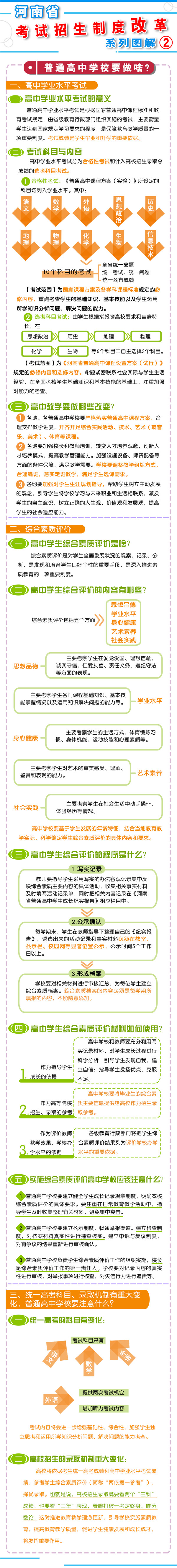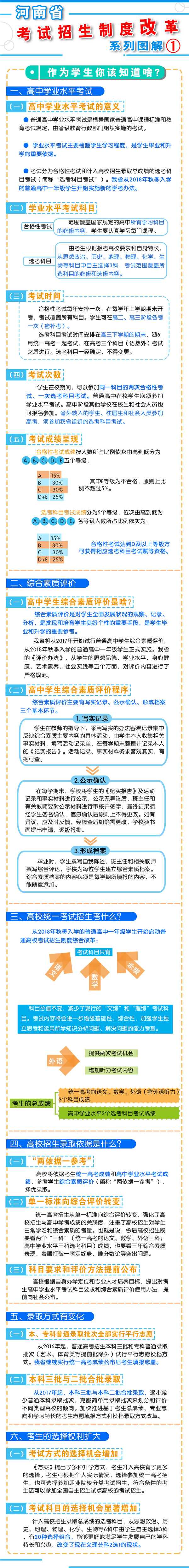 五、2018年秋季開始實(shí)施 從2018年秋季入學(xué)的普通高中一年級學(xué)生開始啟動普通高??荚囌猩贫染C合改革?! ≡诟母锟荚嚳颇吭O(shè)置上,不分文理科,外語科目提供兩次考試機(jī)會。考生的總成績由統(tǒng)一高考的語文、數(shù)學(xué)、外語(含外語聽力)3個科目成績和高中學(xué)業(yè)水平3個選考科目考試成績組成。保持統(tǒng)一高考的語文、數(shù)學(xué)、外語分值不變?! ≡诟母镎猩浫C(jī)制上,推進(jìn)基于統(tǒng)一高考成績和高中學(xué)業(yè)水平考試成績、參考學(xué)生綜合素質(zhì)評價的多元錄取機(jī)制改革。高校要根據(jù)自身辦學(xué)定位和專業(yè)人才培養(yǎng)目標(biāo),提出對考生高中學(xué)業(yè)水平考試科目要求和綜合素質(zhì)評價使用辦法,提前向社會公布?! ?016年省教育行政部門出臺普通高中學(xué)業(yè)水平考試實(shí)施辦法和普通高中學(xué)生綜合素質(zhì)評價實(shí)施辦法,從2018年秋季入學(xué)的普通高中一年級學(xué)生開始正式實(shí)施?! ?strong>省教育廳文件通知: 1、關(guān)于印發(fā)《河南省普通高中學(xué)業(yè)水平考試實(shí)施辦法(試行)》的通知 2、關(guān)于印發(fā)《河南省普通高中學(xué)生綜合素質(zhì)評價實(shí)施辦法(試行)》的通知