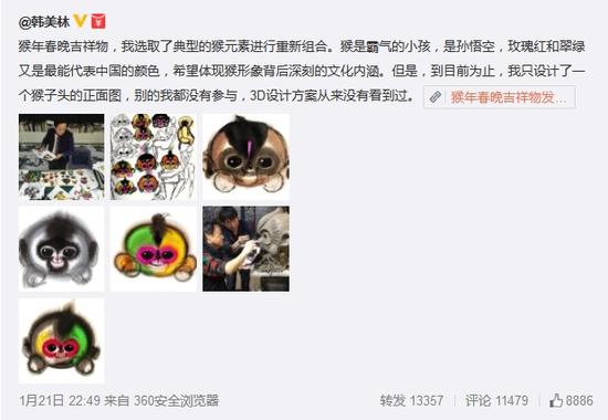 春晚吉祥物康康由“福娃”的創(chuàng)作者之一韓美林設(shè)計,官方稱是以中國傳統(tǒng)水墨畫的藝術(shù)形式,生動表現(xiàn)出“猴”的機靈活潑特點??纯错n老師的手稿,也是能get到喜慶的氛圍和毛茸茸的手感,還算是只討人喜愛的猴子↓