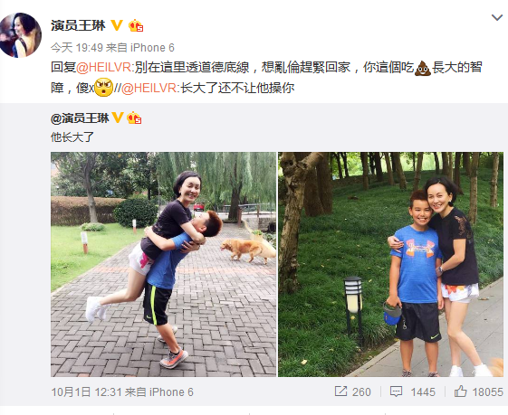 看到這一對高顏值的母子后,網(wǎng)友留言表示羨慕,但有人卻在微博下辱罵到:“長大了還不讓他x你。”此毀三觀評論也惹怒王琳。