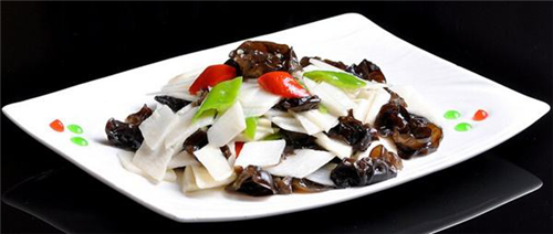 清炒山藥木耳:第一步準(zhǔn)備食材,把山藥用火燎掉須根,用工具打去表皮,洗凈切成梯形寸段,焯水30秒撈出投涼,切成菱形片,焯水30秒撈出投涼;然后將木耳摘洗干凈,撕成小塊,焯水1分鐘撈出投涼;準(zhǔn)備好蔥姜切絲。第二步:將鍋中加植物油燒熱,下蔥姜絲爆香,倒入蠔油山藥和木耳,烹入料酒,撒上精鹽翻炒均勻,勾薄芡,放味精,淋明油出鍋裝盤即可。