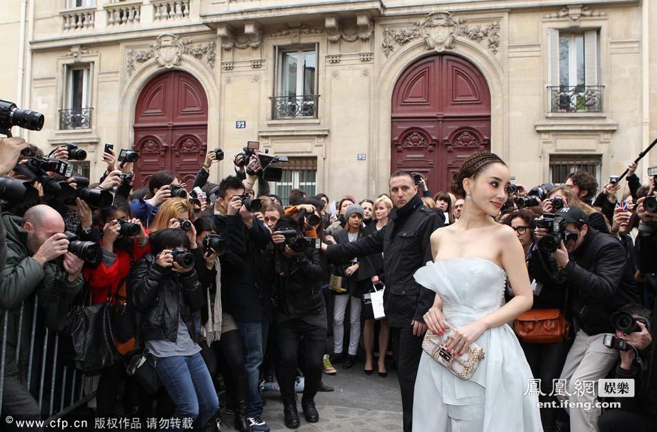 當(dāng)?shù)貢r間3月2日,巴黎,2012巴黎時裝周(秋冬):某品牌秀場,中國明星扎堆看秀。李小璐“阿凡達”發(fā)型個性亮相,身著月牙色抹胸裙甜美,“童顏巨乳”成功吸睛。張雨綺和Angelababy都身披皮草亮相彰顯貴氣。林鵬發(fā)型夸張,粗黑鬢角酷似貓王氣場十足。社交名媛、珠寶設(shè)計師萬寶寶也亮相了秀場。