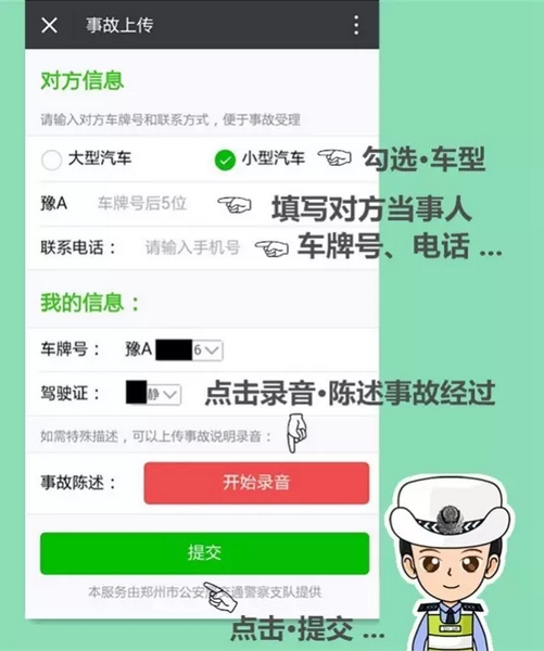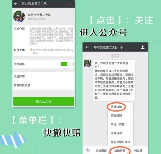 支隊(duì)科研所此次研發(fā)的交通事故快賠快撤功能,跳出了以往單方損失2000元以下的限制,只要在交警二大隊(duì)轄區(qū):嵩山路(含)嵩山路以西區(qū)域及中原區(qū)、西開(kāi)發(fā)區(qū)全境,公共道路上發(fā)生的兩車(chē)事故,車(chē)輛能夠正常駕駛,沒(méi)有人員受傷,就可以通過(guò)“鄭州交巡警二大隊(duì)微信公共平臺(tái)”進(jìn)行快撤快賠處理。