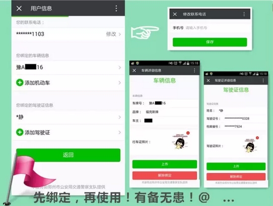 分別填寫(xiě):聯(lián)系電話、綁定車(chē)輛信息、綁定駕駛證信息確認(rèn)無(wú)誤后按確定保存。