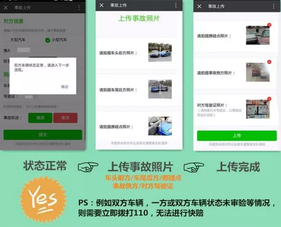 該功能上線后,親們,再也不用站路邊“說(shuō)個(gè)舌尖帶火,嗓子冒煙”了,只需拍幾張現(xiàn)場(chǎng),照片發(fā)個(gè)微信就可以馬上閃人、撤離事故現(xiàn)場(chǎng)!既不造成交通擁堵又安全省力。