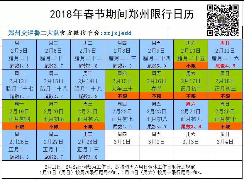 依據(jù)《國(guó)務(wù)院辦公廳關(guān)于2018年部分節(jié)假日安排的通知》(國(guó)辦發(fā)明電〔2017〕12號(hào))(以下簡(jiǎn)稱為《通知》)和《鄭州市人民政府關(guān)于實(shí)施機(jī)動(dòng)車限行措施的通告》(鄭政通〔2017〕42號(hào))(以下簡(jiǎn)稱為《通告》),現(xiàn)將2018年春節(jié)假期前后的機(jī)動(dòng)車限行規(guī)定通知如下: