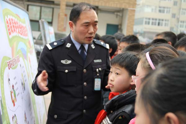 小學(xué)生們認(rèn)真聽警察叔叔講解安全知識(shí)