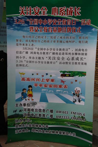 2012年3月26日是第十七個(gè)“全國(guó)中小學(xué)安全教育日”,在教育日當(dāng)天舉行“中小學(xué)安全教育基地”掛牌儀式,河南電臺(tái)信息廣播依托日常欄目《法制新河南》的整合資源,將中小學(xué)安全宣傳教育常態(tài)化。據(jù)河南電臺(tái)信息廣播總監(jiān)李金鋒介紹,“教育基地建立以后,河南電臺(tái)信息廣播將聯(lián)合鄭州市公安局柳林分局,通過信息廣播AM603、FM105.6廣播頻率,以《法制新河南》欄目為陣地,長(zhǎng)期持久的宣傳中小學(xué)安全教育知識(shí),并為柳林鎮(zhèn)第四小學(xué)的學(xué)生提供書籍、器械等安全教育的物品,節(jié)目主持人和柳林分局的警官還將不定期的深入校園內(nèi),跟學(xué)生們面對(duì)面的交流、一對(duì)一的輔導(dǎo)?!?br />