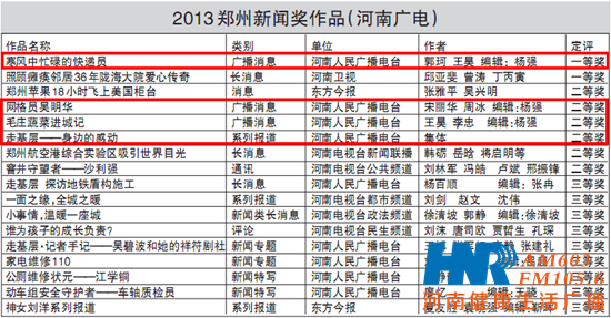 首屆“鄭州新聞獎”在北京評審,評委會對參評作品進行了認(rèn)真細致的評議,經(jīng)過初評、定評共評出特等獎3篇、一等獎14篇、二等獎30篇、三等獎42篇。頒獎會對獲獎?wù)哳C發(fā)了證書和獎杯,并給予一等獎5000元、二等獎3000元、三等獎2000元的獎勵。河南人民廣播電臺報送的作品以新聞性強、主題重大、思想深刻、制作精良、廣播特色突出而獲評委好評。其中河南電臺信息廣播郭珂、王昊采寫的消息《寒風(fēng)中忙碌的快遞員》,通過對鄭州市一名普通快遞員劉師傅的跟隨式采訪,將他真實的工作狀態(tài)和內(nèi)心世界一一展現(xiàn),生動、感人,獲得了一等獎;《網(wǎng)格員吳明華》、《毛莊蔬菜進城記》、《走基層——身邊的感動》 3 件作品獲得二等獎;《走基層 探訪地鐵盾構(gòu)施工》等5件作品獲得三等獎。河南電臺信息廣播記者郭珂作為獲獎記者代表在頒獎會上發(fā)了言,表示要按照河南臺的要求和安排,進一步轉(zhuǎn)變作風(fēng),寫出面貌一新、聽眾喜聞樂見、無愧于偉大時代的作品來。