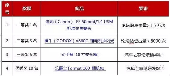為了滿足眾多攝影愛好者和車迷們的拍攝需求,中原國際車展聯(lián)合攝影愛好者協(xié)會共同舉辦“中原國際車展汽車攝影大賽”。只要你愛車、喜歡拍照,就可以報(bào)名參賽!此外,在汽車之家發(fā)布論壇帖可以獲得大獎喲~