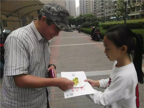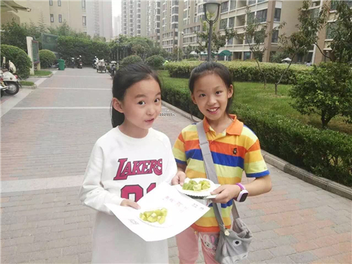 看我們兩位小小志愿者,把新鮮美味的獼猴桃送給小區(qū)的居民品嘗。