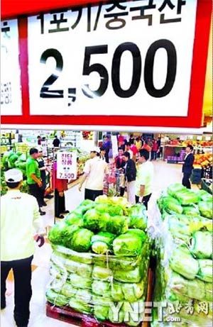 本月初,韓國政府決定從中國進(jìn)口白菜以緩解國內(nèi)市場的壓力。最早在韓國市場上售賣中國進(jìn)口白菜的是韓國大型連鎖超市——樂天超市。最初從中國進(jìn)口的3萬棵白菜于本月9日到10日分別在首都圈范圍內(nèi)33個樂天超市銷售,每棵價格為2500韓元(約合人民幣15元)。此前樂天公司方面曾公開表示,所有進(jìn)口的中國白菜都經(jīng)過了國立食品檢疫院的檢查,可以放心購買。另外樂天公司將盡量縮短從產(chǎn)地到韓國的運(yùn)輸時間,以保證白菜的新鮮。