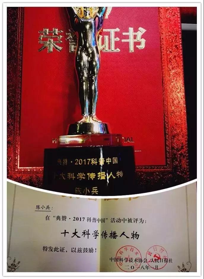 陳小兵當選“2017年十大科學傳播人物”,組委會給予他的頒獎詞是,在緊張的臨床工作之余,他熱心醫(yī)學科普,下基層、走街道、進校園、入社區(qū),腳步走遍中原,做科普講座300余場,受眾十余萬人,積極推廣“預防為主”的防癌理念,為腫瘤科普殫精竭慮,被譽為“中原腫瘤科普第一人”。