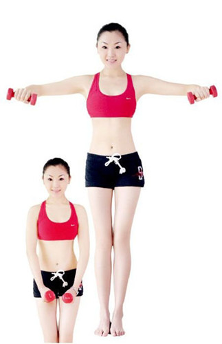 動作要領(lǐng):雙手握啞鈴放于身體前,膝蓋微微彎曲。手臂慢慢向兩側(cè)抬起呈半圓形,大臂盡量向后靠,注意腕關(guān)節(jié)要低于肘關(guān)節(jié),肘關(guān)節(jié)要低于肩關(guān)節(jié)。返回至初始位置,重復(fù)20~30次,每回至少做4組,每組之間要有間隙。