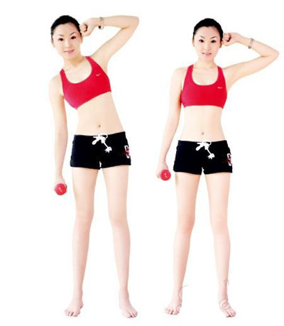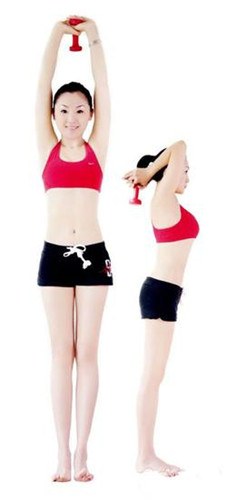 動作要領(lǐng):雙臂盡量向上伸展,夾緊耳朵,身體拉直。大臂保持不動,小臂彎曲,盡量向下。然后,返回至初始位置。每組動作重復(fù)20~50次,每回至少做4組,每組之間要有間隙。