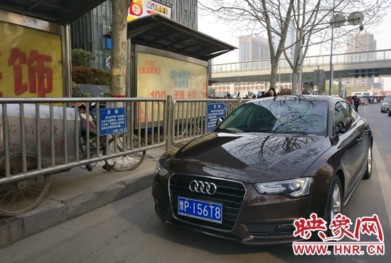下午3時許,記者在花園路國貿(mào)360商場門前的公交站牌看到,多輛出租車和私家車將整座公交站停滿,而公交車迫于無奈只能在路中間停靠。一輛車牌號為豫AS578W的機動車司機在民警的勸說之下駛離了公交站,而另一輛車牌號為豫PI56T8的機動車同樣停在公交站,因車內(nèi)無人,民警對其進行了處罰。
