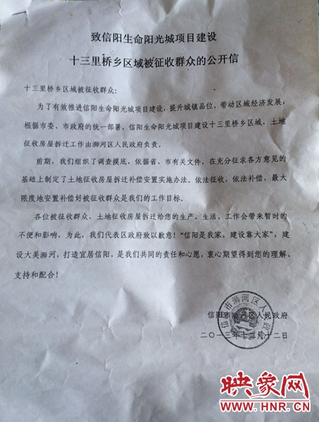 浉河區(qū)政府下達(dá)的征收公開信 吳彥飛 攝