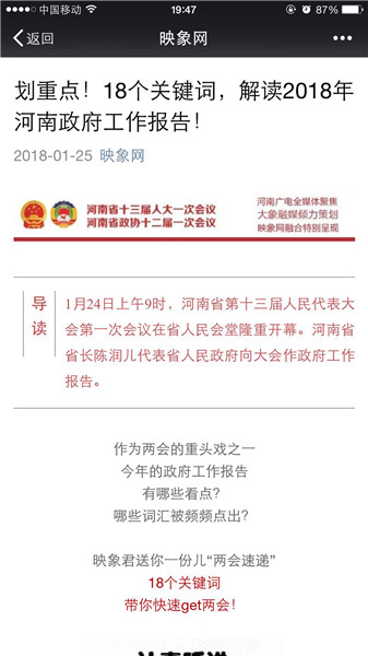 映象網(wǎng)官方微信策劃推出原創(chuàng)策劃《河南人,2018給你穩(wěn)穩(wěn)的幸福!》、《你好,我是河南!這是我的五年成績(jī)單,請(qǐng)接收!》、《2018年,河南都有哪些“小目標(biāo)”?》、《劃重點(diǎn)!18個(gè)關(guān)鍵詞,解讀2018年河南政府工作報(bào)告!》。每篇都刷屏朋友圈,網(wǎng)友積極轉(zhuǎn)發(fā)點(diǎn)贊,稱(chēng)“看完真的覺(jué)著穩(wěn)穩(wěn)的幸福”。