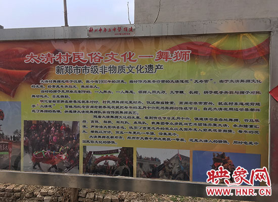 太清村村主任王會(huì)甫介紹,他們村的舞獅、舞龍表演,始于1900年前的漢代。明代首相(首輔)高拱在新春巡視太清村時(shí),村民組織高規(guī)格的舞龍、舞獅表演隊(duì)來(lái)歡迎首輔,規(guī)格很高。高拱非常高興,當(dāng)場(chǎng)在村里的太清觀前題詞。百姓們?yōu)榱思o(jì)念高拱在新春巡視,就把每年的正月十六定為舞獅的傳統(tǒng)節(jié)日。自此,周邊鄰縣都興起了舞獅熱潮,并在正月十六這一天匯集到太清村進(jìn)行舞獅表演,延續(xù)至今。太清村的舞獅隊(duì)在2002年獲鄭州市舞獅大賽一等獎(jiǎng)。