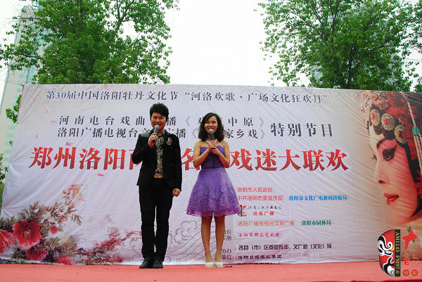 4月17日上午,在位于洛陽(yáng)市中心、以體現(xiàn)周朝文化為主題的周王城廣場(chǎng),“周公營(yíng)建洛邑”雕塑旁,主辦方舉辦了一場(chǎng)別開生面的戲曲演唱會(huì)。來(lái)自鄭州、洛陽(yáng)兩地的豫劇名家張?jiān)聵s、曾廣蘭、趙曉梅、王藝紅,著名演員徐俊霞、陳大華、劉亞林、曲韻、劉海功、沈萍,梨園春明星擂主張艷紅、謝憲笙等為來(lái)自全省各地的戲曲廣播《戲迷俱樂部》百余位戲迷和現(xiàn)場(chǎng)的廣大觀眾奉獻(xiàn)了精彩的戲曲唱段。藝術(shù)家們演唱的《洛陽(yáng)橋》、《秦雪梅》、《七品芝麻官》、《對(duì)花槍》、《拷紅》、《收姜維》、《朝陽(yáng)溝》、《倒霉大叔的婚事》、《小白鞋說媒》、《紅菊》等不同劇種、不同流派、不同行當(dāng)?shù)哪捴巳丝诘某?,博得觀眾一陣又一陣的掌聲,河南戲曲廣播主持人媛媛、李鋮表演的雙簧妙趣橫生,引得觀眾樂不可支。