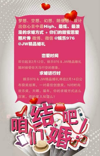 2月12日娛樂(lè)976全新上線,我們?yōu)槟蛟煲粓?chǎng)廣播史上最時(shí)尚最浪漫的求婚派對(duì)+結(jié)婚盛典!只要心中有愛(ài),求婚方式可以多姿多彩,怎樣的求婚才能讓她難忘、心甘情愿說(shuō)“I do!”?現(xiàn)在,只要有創(chuàng)意的求婚方式,就可以獲得10萬(wàn)元求婚+結(jié)婚盛典!求婚,你準(zhǔn)備好了嗎?咱們結(jié)婚吧!
