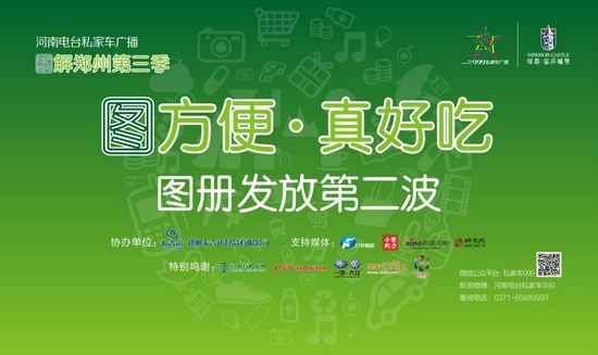 河南電臺私家車廣播2013大型公益系列活動——“圖解鄭州”第三季圖方便·真好吃,圖冊發(fā)放第二波于2013年7月7日在鄭州市東風路與天明路交匯處的天旺優(yōu)庫和商都路與七里河南路交匯處的華豐燈飾界免費發(fā)放。
