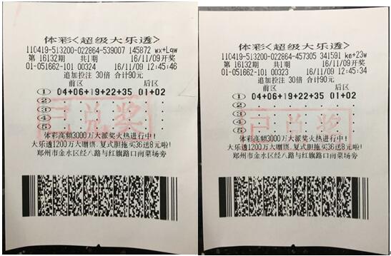 彩民在鄭州東區(qū)體彩分中心兌獎的兩張彩票--- 60倍