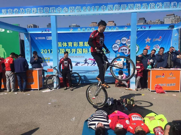 在鄭開小馬拉松嘉年華現(xiàn)場,河南體彩組織的品牌展示活動也在火熱進行中:激情的舞蹈,配以精彩的活動,還有現(xiàn)場的即開型彩票銷售,吸引了大量的群眾參與。