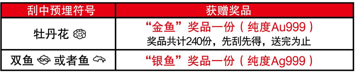 活動(dòng)期間,彩民在我省任一體彩銷售網(wǎng)點(diǎn)購買30元面值“富貴有余”主題即開票,若單張彩票刮出符合獎(jiǎng)勵(lì)條件的預(yù)埋符號(hào),并經(jīng)兌獎(jiǎng)設(shè)備(IVT或BCR等)完成掃描確認(rèn)(促銷兌獎(jiǎng))且剪角處理后,即可獲贈(zèng)精美獎(jiǎng)品一份,詳見下表: