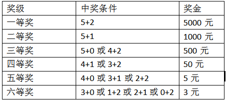 一等獎:投注號碼與“樂善碼”的5個(gè)前區(qū)號碼(順序不限,下同)和2個(gè)后區(qū)號碼(順序不限,下同)相同,即中獎,獎金為5000元;