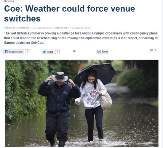 新浪體育訊 今年6月的降雨量已達(dá)英國同期天氣之最,而根據(jù)英國氣象系統(tǒng)的數(shù)據(jù)預(yù)測英國的降雨還將繼續(xù),這屆奧運(yùn)會很可能將成為史上遭遇降雨最多的一屆。