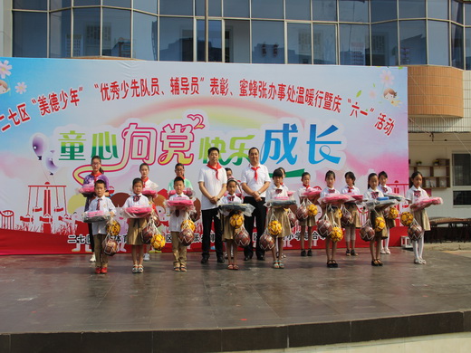 5月31日,二七區(qū) “星級(jí)美德少年”、“認(rèn)星爭(zhēng)優(yōu)”活動(dòng)優(yōu)秀學(xué)校、優(yōu)秀教師、優(yōu)秀家長(zhǎng)、“十佳少先大隊(duì)”、“十佳少先隊(duì)干”、 “十佳少先隊(duì)輔導(dǎo)員”、“百佳少先隊(duì)員”頒獎(jiǎng)儀式、蜜蜂張辦事處溫暖行暨慶“六一”活動(dòng)在鄭州市二七區(qū)京廣路小學(xué)舉行。